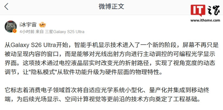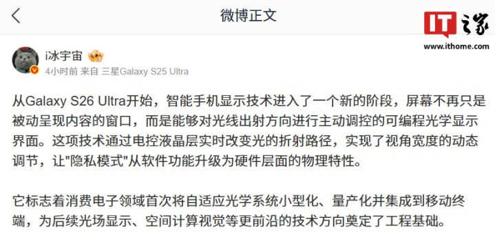 IT之家1月29日消息,博主@i冰宇宙今日发文介绍,三星GalaxyS26Ultra的隐私屏幕本质上是一个通过分子级可控光学结构,对光传播方向进行主动管理的可编程显示屏。