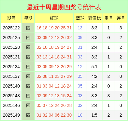 根据上方【最近10个星期四奖号统计表】可知,上个星期四红球奖号为01、02、04、06、22、30,奇偶比为1:5,最近十个星期四开出的红球奇偶比为28:32,本周四可以考虑奇偶比为2:4。